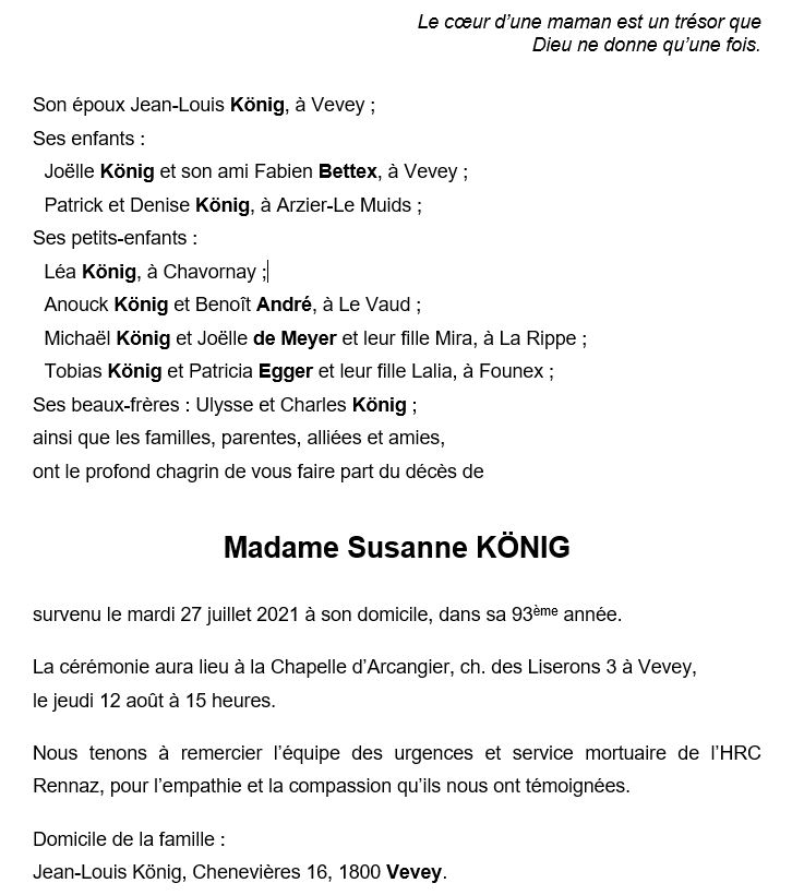 Susanne KÖNIG 05 aoû. 1928 - 27 juil. 2021 Avis mortuaire PFG Télecharger PDF Partager sur: Galerie PreviousNext PreviousNext