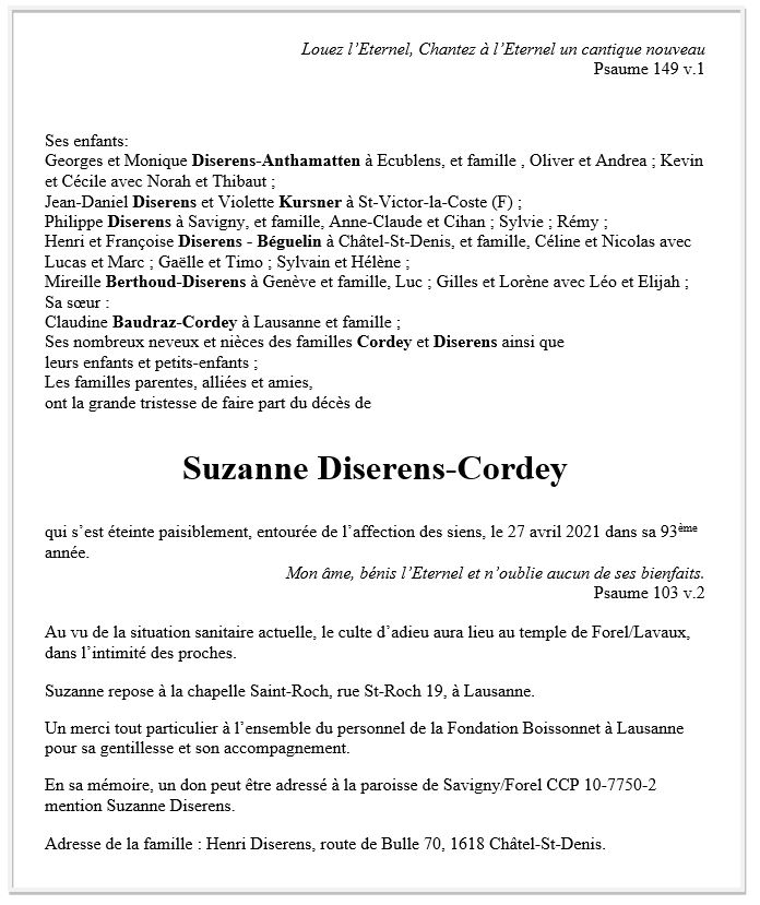 Suzanne DISERENS-CORDEY 02 nov. 1928 - 27 avr. 2021 Avis mortuaire PFG Télecharger PDF Partager sur: Galerie PreviousNext PreviousNext