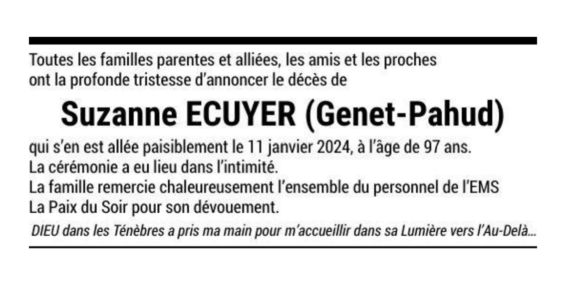 Suzanne ECUYER (Genet-Pahud) 01 jan. 1927 - 11 jan. 2024 Avis mortuaire PFG Télecharger PDF Partager sur: Galerie PreviousNext PreviousNext