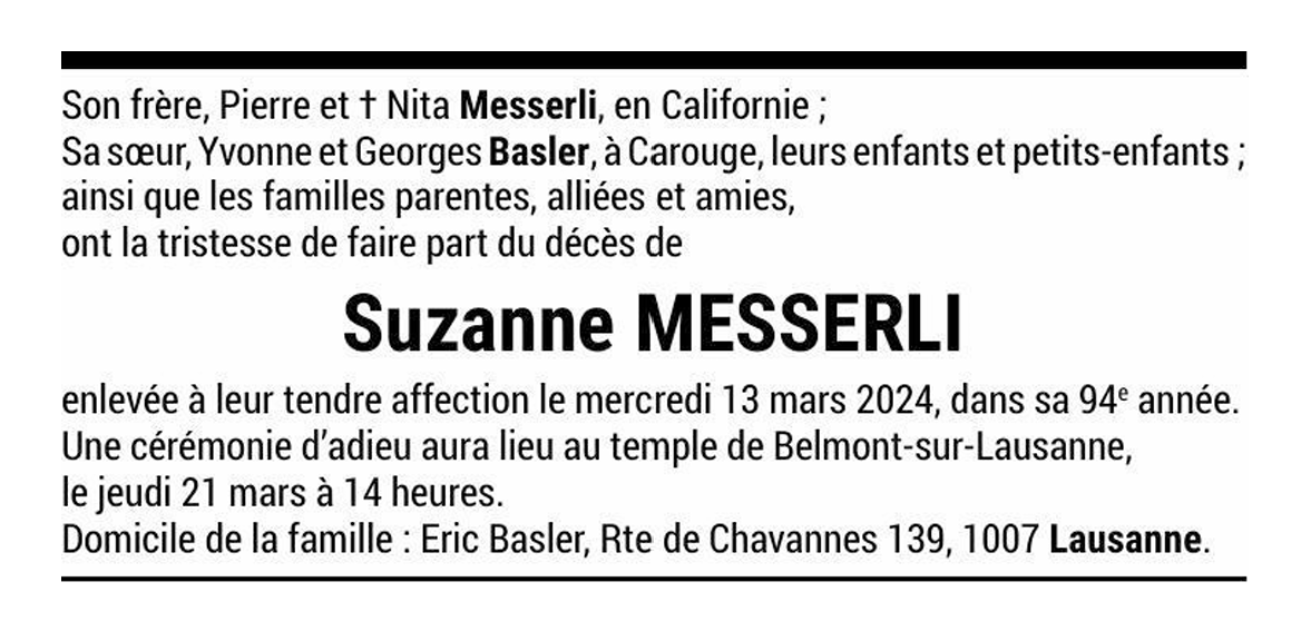Suzanne MESSERLI 21 nov. 1930 - 13 mar. 2024 Avis mortuaire PFG Télecharger PDF Partager sur: Galerie PreviousNext PreviousNext