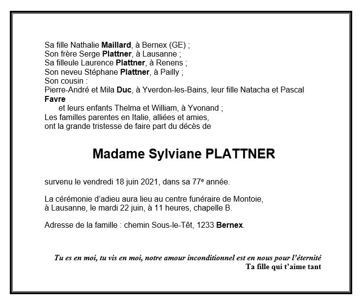 Sylviane PLATTNER 25 oct. 1944 - 18 juin. 2021 Avis mortuaire PFG Télecharger PDF Partager sur: Galerie PreviousNext PreviousNext