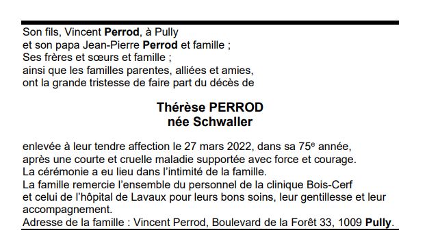 Thérèse PERROD 26 nov. 1947 - 27 mar. 2022 Avis mortuaire PFG Télecharger PDF Partager sur: Galerie PreviousNext PreviousNext