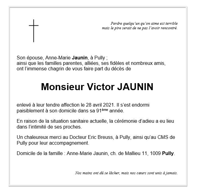 Victor JAUNIN 12 juin. 1930 - 28 avr. 2021 Avis mortuaire PFG Télecharger PDF Partager sur: Galerie PreviousNext PreviousNext
