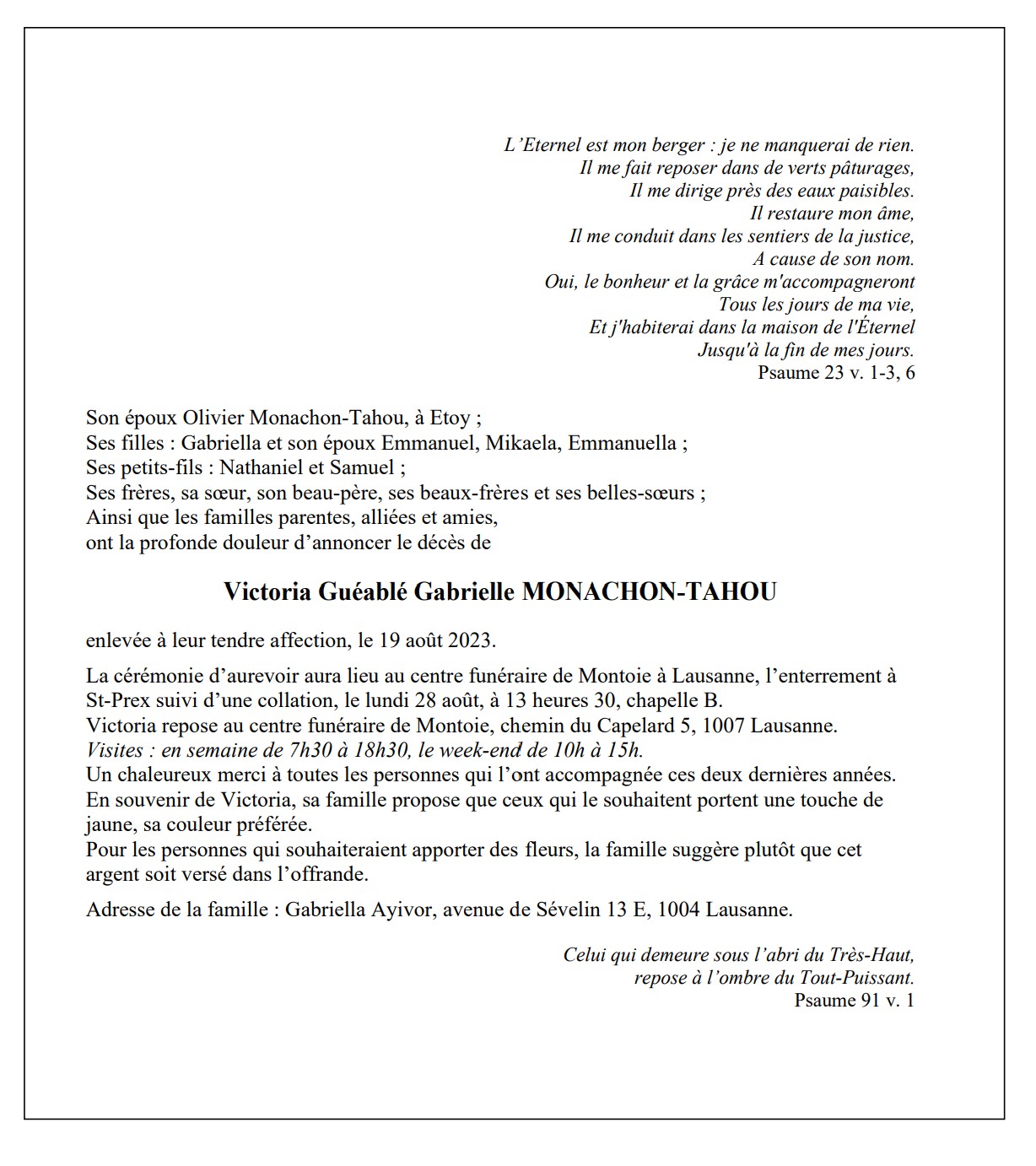 Victoria Guéablé Gabrielle MONACHON-TAHOU 28 juin. 1970 - 19 aoû. 2023 Avis mortuaire PFG Télecharger PDF Partager sur: Galerie PreviousNext PreviousNext
