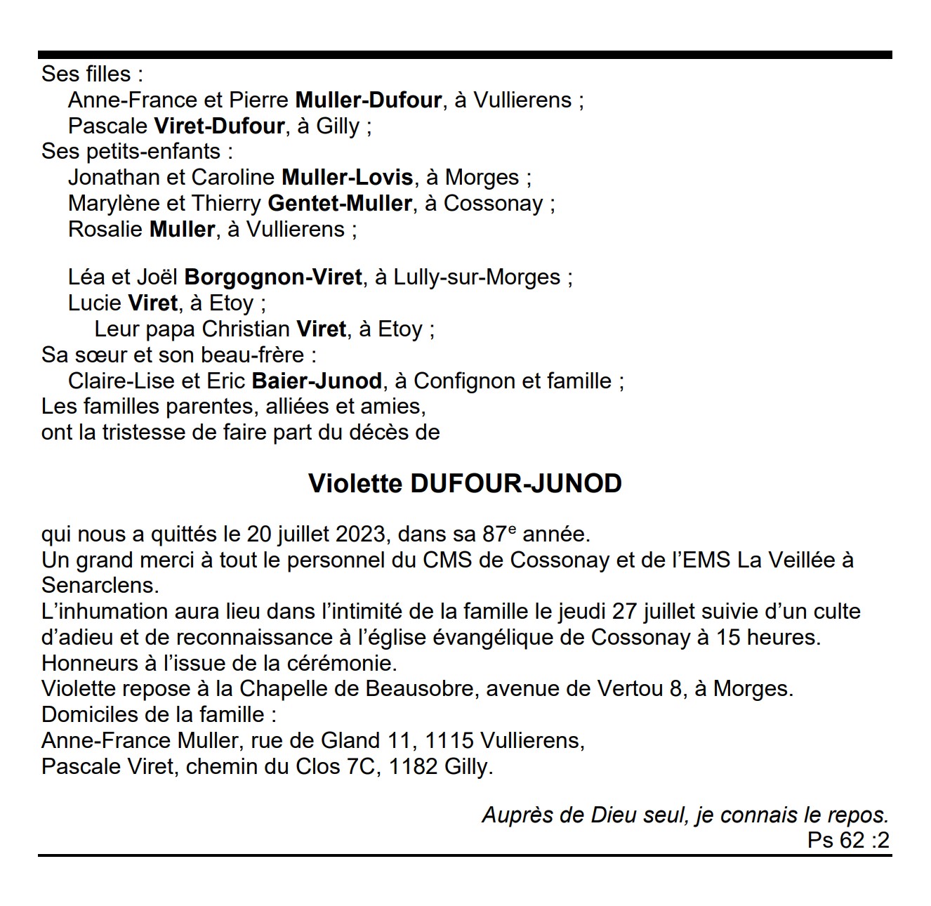 Violette DUFOUR-JUNOD 30 jan. 1937 - 20 juil. 2023 Avis mortuaire PFG Télecharger PDF Partager sur: Galerie PreviousNext PreviousNext
