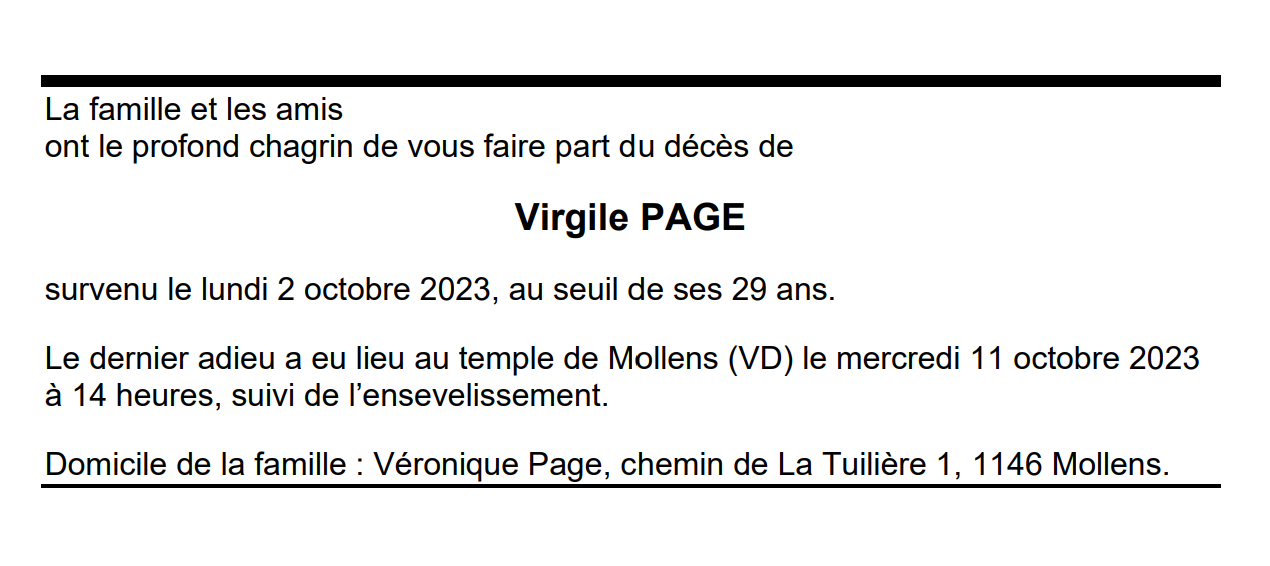 Virgile PAGE 22 nov. 1994 - 02 oct. 2023 Avis mortuaire PFG Télecharger PDF Partager sur: Galerie PreviousNext PreviousNext