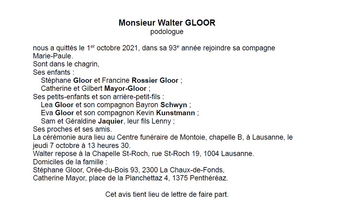 Walter Gloor 23 mai. 1929 - 01 oct. 2021 Avis mortuaire PFG Télecharger PDF Partager sur: Galerie PreviousNext PreviousNext