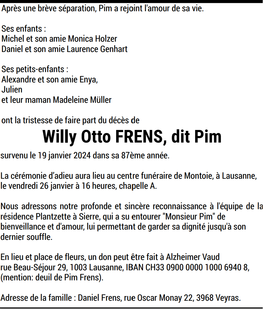 Willy Otto FRENS, dit Pim 28 fév. 1937 - 19 jan. 2024 Avis mortuaire PFG Télecharger PDF Partager sur: Galerie PreviousNext PreviousNext
