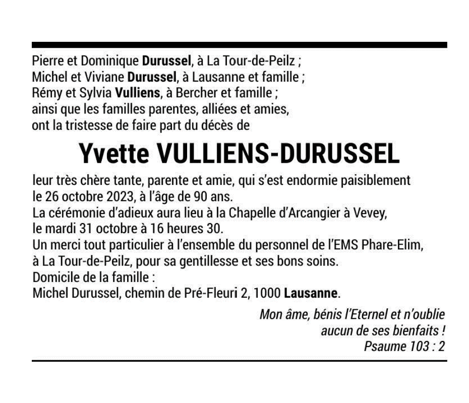 Yvette VULLIENS-DURUSSEL 18 déc. 1932 - 26 oct. 2023 Avis mortuaire PFG Télecharger PDF Partager sur: Galerie PreviousNext PreviousNext