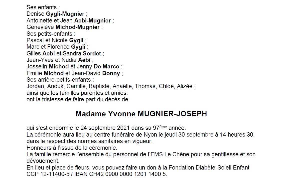 Yvonne MUGNIER-JOSEPH 13 mai. 1925 - 24 sep. 2021 Avis mortuaire PFG Télecharger PDF Partager sur: Galerie PreviousNext PreviousNext
